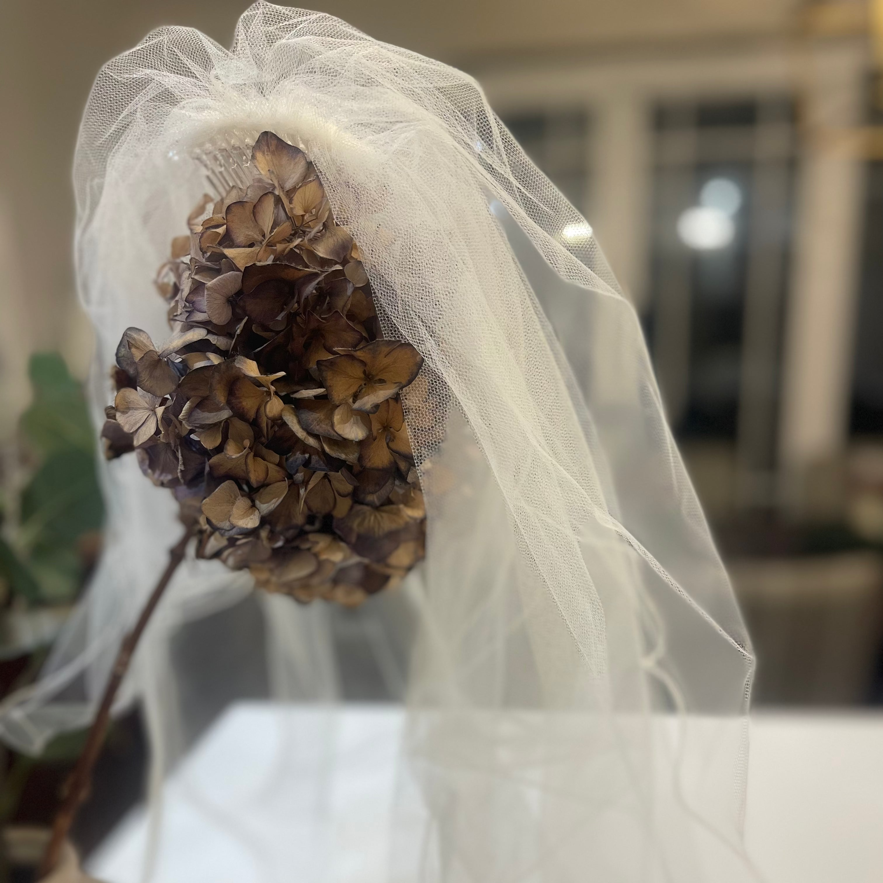 Longest tier of 50 cm and a shortest tier of 35 cm, finished with delicate thread trim.  This is a full veil and is secured with a transparent plastic comb for easy placement.