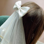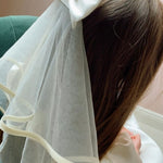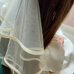 This delicate double-tier veil measures 30 cm in length and is finished with a satin trim. It is attached to a satin comb for easy placement.