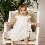 Ana - this stunning Christening dress is a perfect old-world blend of timeless luxury. This dress highlights elegant lines of lace to the front of the dress and is trimmed with a frill neckline, the little peaky short sleeve stands to attention, and the lace hemline is accompanied by beautifully paneled lace in the skirt with an open back for easy access and all tied together with two satin tie ribbons to the sides. Ana is just that little bit different but will remain in your family for generations.