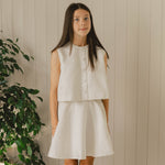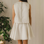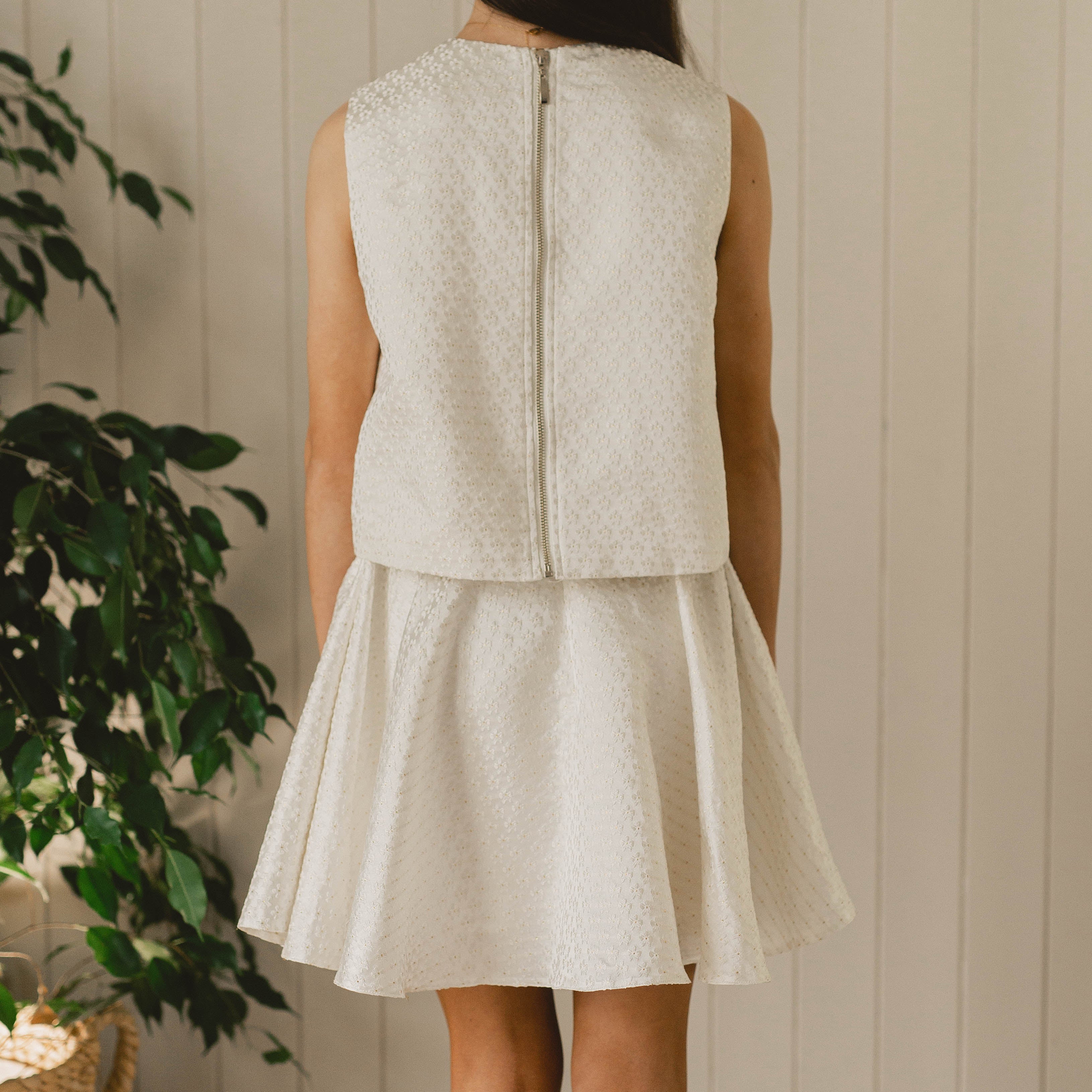 Crafted from a luxurious embossed cream and gold floral fabric, this unique two-piece set — featuring a top and skirt — is designed for girls who love something a little different. The top showcases a vertical row of buttons with an exposed gold zip at the back, while the skater-style skirt features a flattering wide waistband for comfort and shape. Both pieces are fully lined with soft satin for a smooth and comfortable fit.