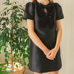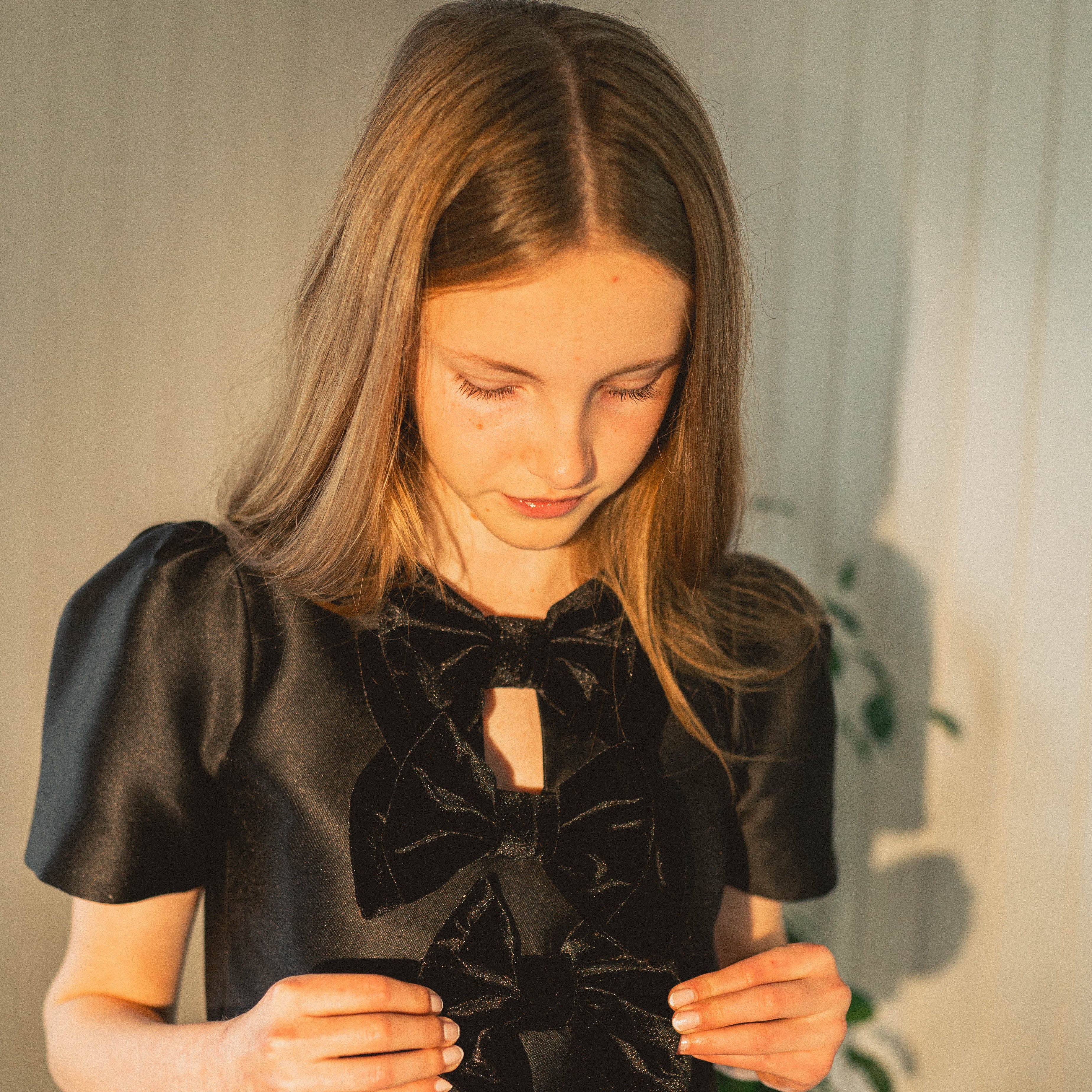 Crafted from luxurious silky matte satin, this shift-style dress has a beautiful soft sheen that catches the light effortlessly. It features a clean silhouette with a round neckline and a charming vertical row of three velvet bows, adding a touch of timeless elegance. The dress is fully lined with soft satin for comfort and a smooth fit.