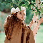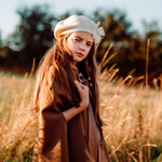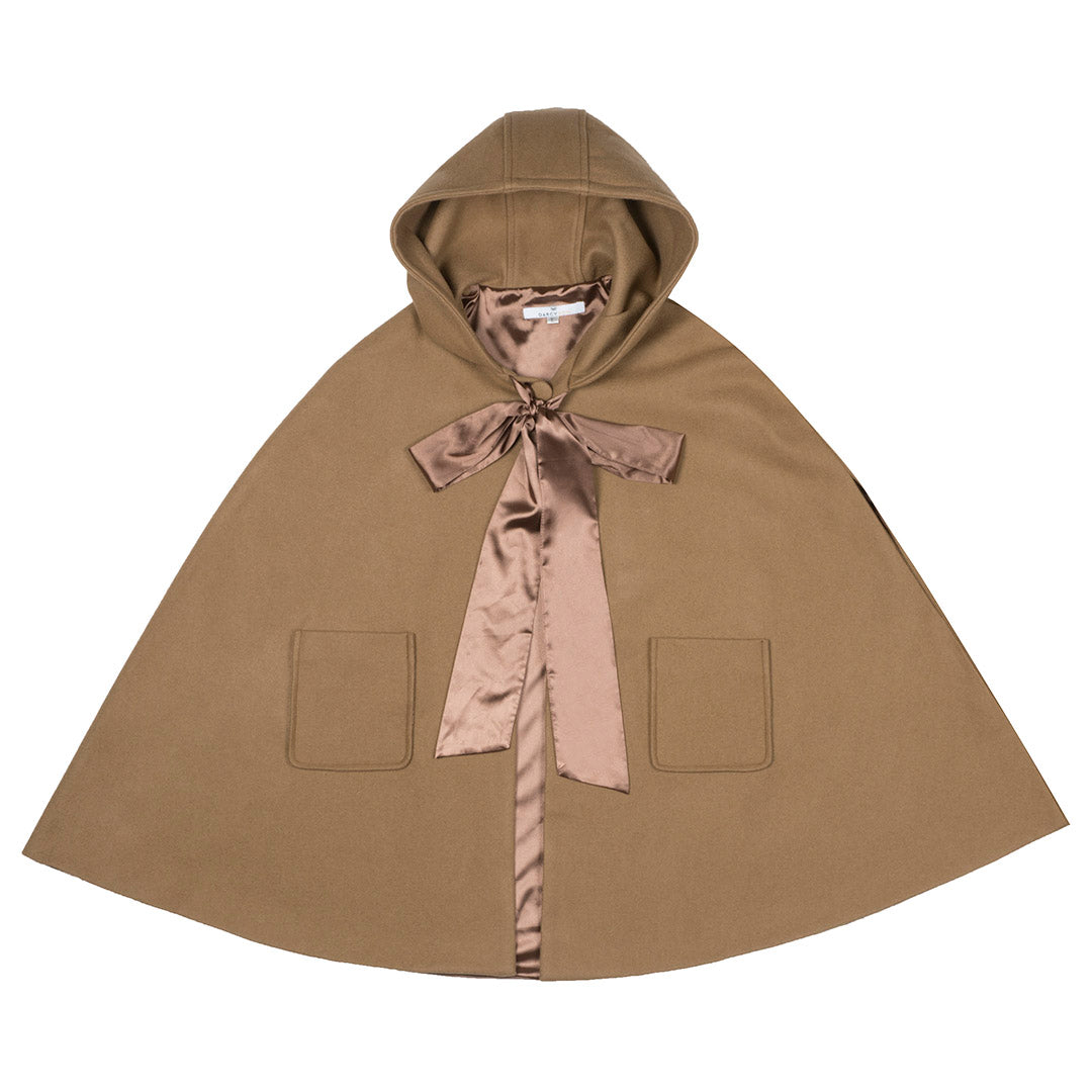 Our Hazel cape is made of super-soft wool in a warm soft smokey tan colour, the cape is a whimsical but very functional piece of outerwear. There’s an oversized hood to snuggle into, two deep front pockets, and a satin lining that lets it slip effortlessly around other fabrics without binding. It closes with a single sturdy button at the neck and a gorgeous silk ribbon tie which can be fashioned into a bow or left loose as streamers.