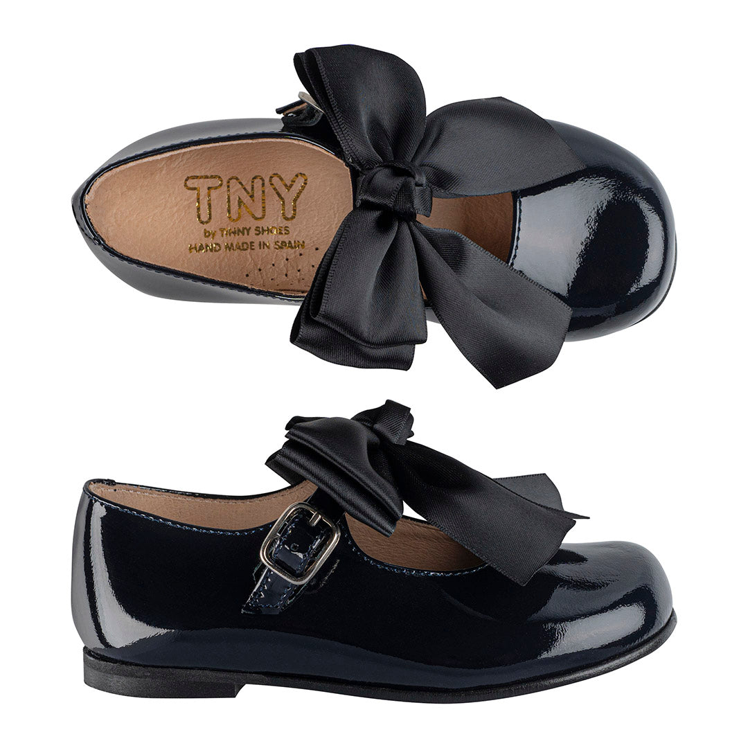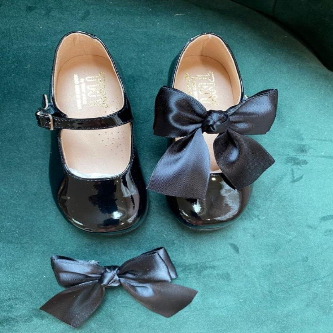 The Bonnie black patent leather Mary-Jane shoe can be worn with the pretty satin bow across the Velcro strap. This bow is detachable, they can also be worn as plain pair of shoes.