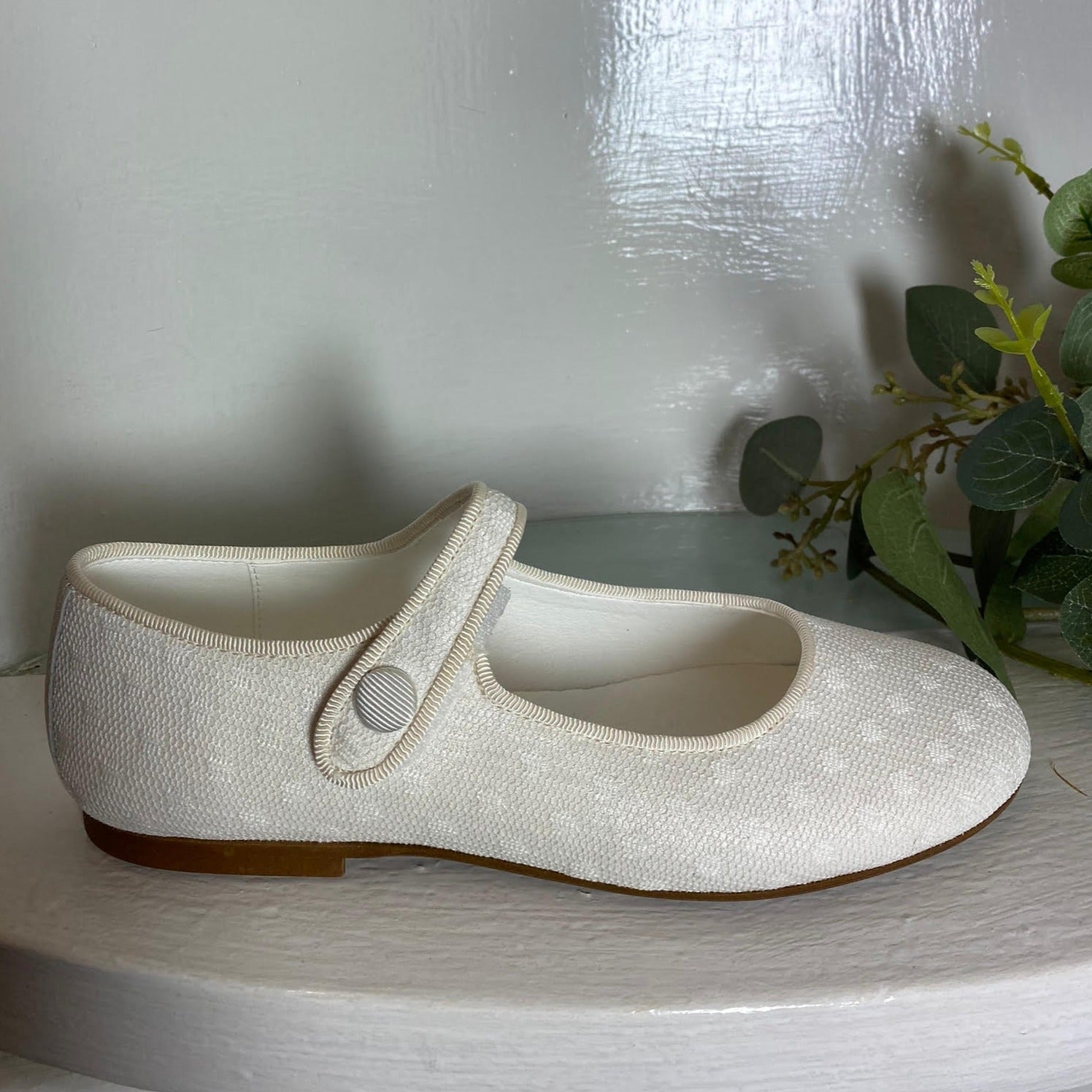 Gabriela is a sweet Mary-Jane–style leather shoe, handmade in Spain with a button Velcro fastening and finished with an ivory grosgrain trim. The design is beautifully covered in ivory tulle with a delicate small plumetti polka dot pattern, making it a perfect match for ivory dresses.