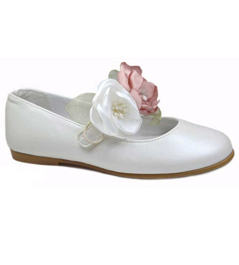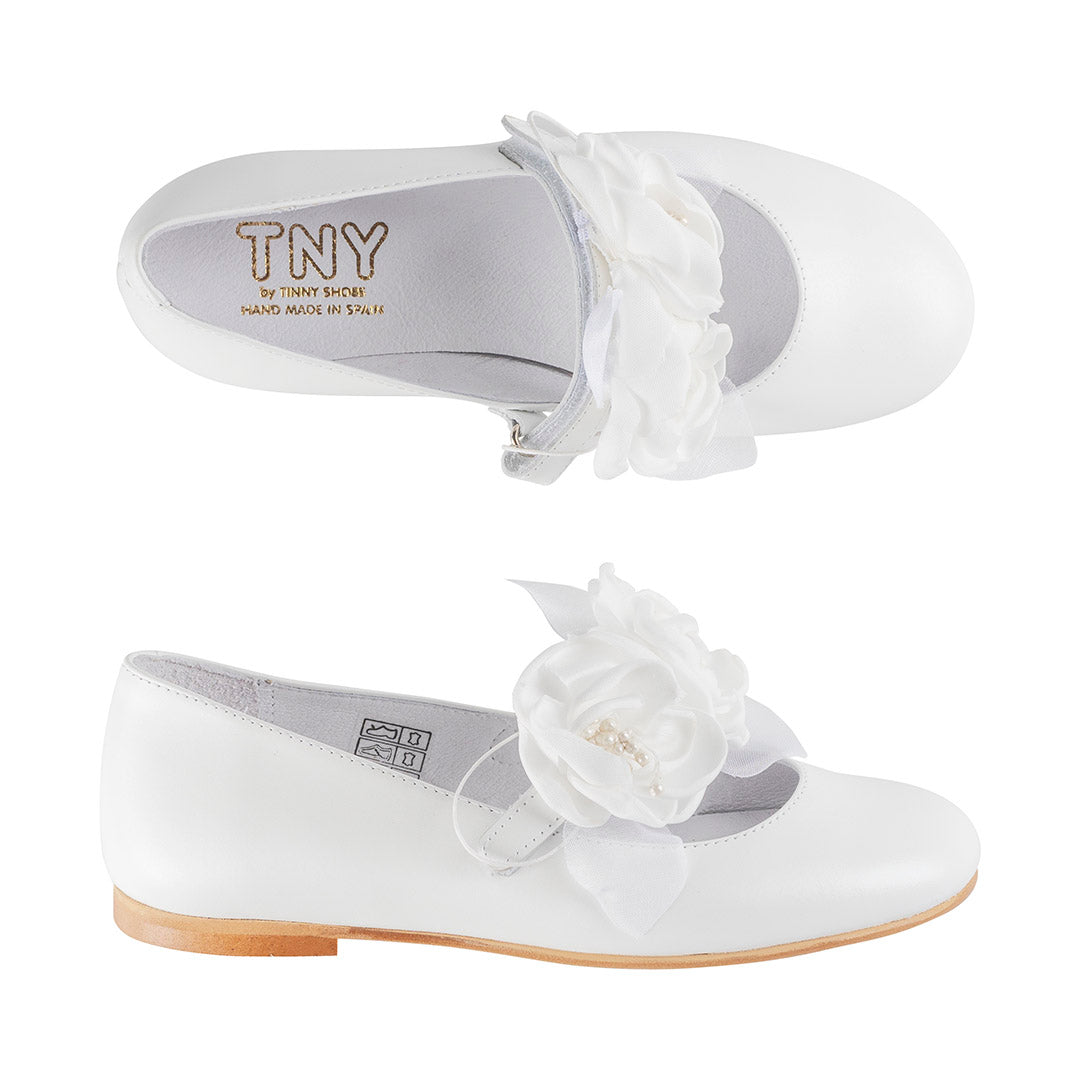Freya is a beautiful white leather ceremony shoe, designed with a delicate fabric flower appliqué across the Velcro strap. For added versatility, the appliqué is detachable — allowing the shoes to be worn plain or with their floral detail, depending on the occasion.