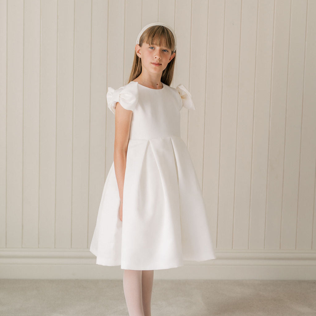 This luxurious communion dress is designed in gorgeous waffle-textured fabric. The skirt borrows from fabulous fifties silhouettes, with box pleats that fall gracefully from a panelled waist. The bodice features a soft bow-style cap sleeve detail.