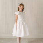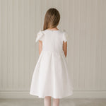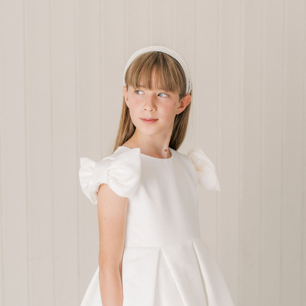 Louisa – Elegant, romantic, and truly unique, the Louisa dress carries a regal charm. Crafted from sumptuous waffle-textured fabric that drapes beautifully, it is finished with refined bow-style cap sleeves for a touch of sweetness. Perfect for the little girl who has always been a princess at heart, but secretly dreams of being a queen.