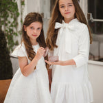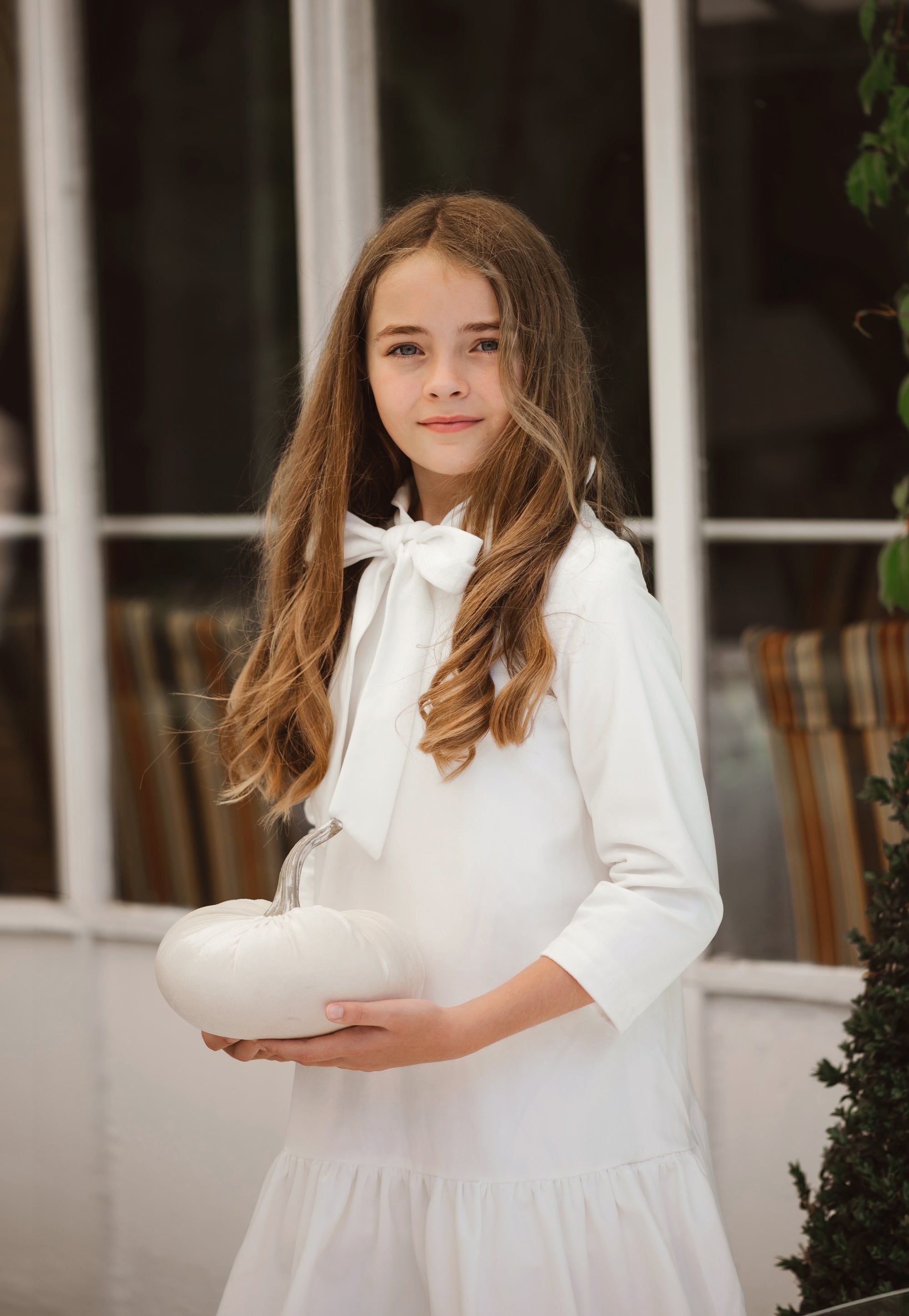 The Francesca dress is designed using warm white cotton velvet, it is the most beautiful fabric! Ultra-soft in touch and in colour, this will be her favourite dress. The neckline boasts a pussy bow detail putting a signature detail of the brand into the spotlight. This elegant design is sure to impress every time she wears it.