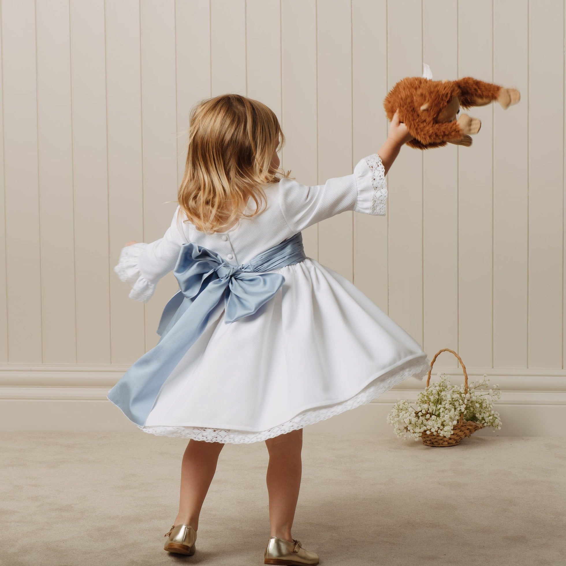 Maya - Our Maya is a soft textured, pique cotton Communion dress. Pique is a cotton knit fabric covered with a tiny, textured pattern and is perfect for a Communion, Wedding Ceremony or Special Occasion. This high-waisted relaxed gathered dress falls into a soft flowing skirt with a lace trim hemline. This 3/4 length sleeve is trimmed with lace. The neckline is high but dips into a soft U-shaped back, trimmed with three pique-covered buttons. It is tied together with a thick pleated sash and side flower applique and an oversized bow to the back. You have the choice of an ivory sash or you can introduce a contrasting colour from a soft palette of colours.